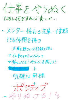 沢山の色んな意見が出ていました。「仕事を楽しむ」「向上心を持つ」「明確な目標を立てる」