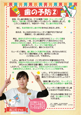 前回、むし歯の原因には、三つの要素「細菌(ミュータンス菌)」 特に、乳幼児期のむし歯の予防を中心にお伝えします。 例えば、もしもお口の中にミュータンス菌がゼロであれば 実は、産まれたばかりの赤ちゃんのお口の中にミュータンス菌は ミュータンス菌は、歯に棲みつく性質があるため、お子さんのお口に しかし、歯が生えていれば、ここぞとばかりに定着を図るのです。 しかし、すでにお子さんのお口に、多くのミュータンス菌感染がある 冒頭に書いたように、ミュータンス菌はむし歯になる原因の一要素です。 ミュータンス菌の伝播=むし歯になるわけではありません。 それ以外の要素に気をつければ、むし歯のリスクも下がります。 (ぱど 大阪東版 2018年2月23日号 |