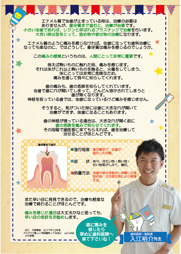 エナメル質で虫歯が止まっている時は、治療の必要は エナメル質のように痛みを感じなければ、虫歯になっても歯科治療に この痛みの感覚というものは、人間にとって非常に重要です。 例えば熱いものに触れた時、痛みを感じます。 歯の痛みも、歯の危険を知らしてくれています。 そうすると、気がついた時には歯に大きな穴が開いて 歯の神経が残っている場合は、大きな穴が開く前に また早い目に発見できるので、治療も軽度な 痛みを感じた場合は大丈夫かなと思っても、