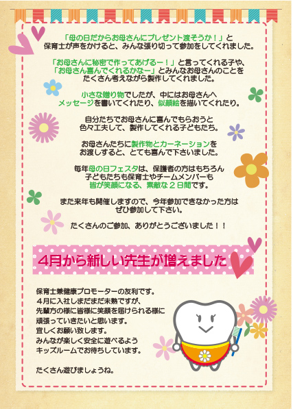 こんにちは! だんだん暑くなってきましたが、皆様 さて、5月10日、11日にキッズルームでは母の日フェスタを