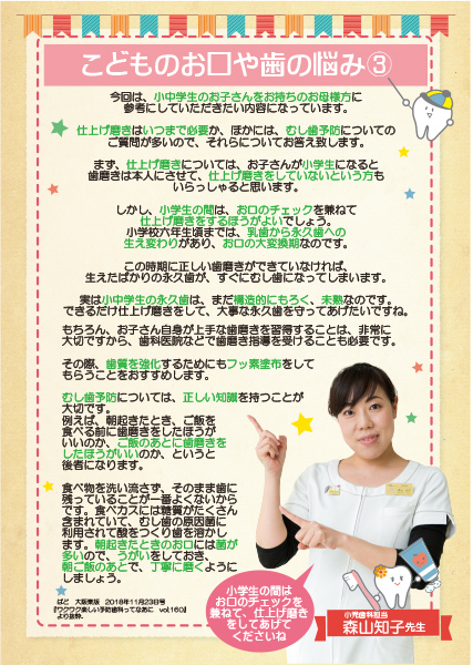 小学校六年生頃までは、乳歯から永久歯への この時期に正しい歯磨きができていなければ、 実は小中学生の永久歯は、まだ構造的にもろく、未熟なのです。 もちろん、お子さん自身が上手な歯磨きを習得することは、非常に その際、歯質を強化するためにもフッ素塗布をしてもらうことをおすすめします。 むし歯予防については、正しい知識を持つことが大切です。 食べ物を洗い流さず、そのまま歯に残っていることが一番よくないからです。 朝起きたときのお口には菌が多いので、うがいをしておき、朝ご飯のあとで ※ぱど 大阪東版 2018年11月23日号 |