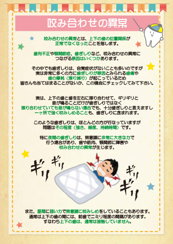 《咬みあわせの異常》咬み合わせの異常とは、上下の歯の位置関係が 歯列不正や顎関節症、歯ぎしりなど、咬み合わせの異常に その中でも歯ぎしりは、自覚症状がないことも多いのですが