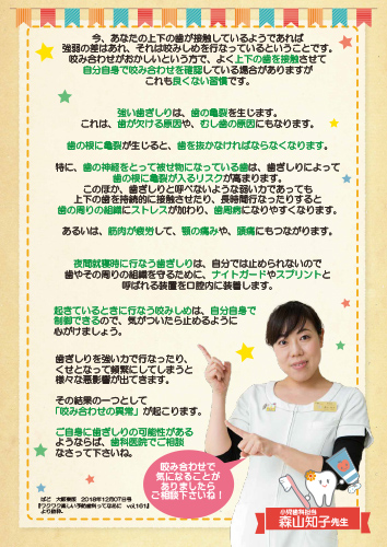 夜間就寝時に行なう歯ぎしりは、自分では止められないので 起きているときに行なう咬みしめは、自分自身で制御できるので 歯ぎしりを強い力で行なったり、くせとなって頻繁にしてしまうと その結果の一つとして「咬み合わせの異常」が起こります。 ご自身に歯ぎしりの可能性があるようならば、歯科医院でご相談 ぱど 大阪東版 2018年12月07日号 |