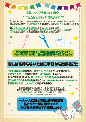 《むしばを作らないために、今日からできること》①むしば菌の住処を知り、歯ブラシとフロスを正しく丁寧に行う。