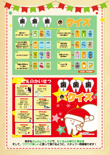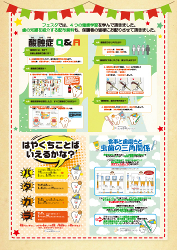 フェスタでは、4つの健康学習を学んで頂きました。 歯の知識を紹介する配布資料も、保護者の皆様にお配りさせて頂きました。