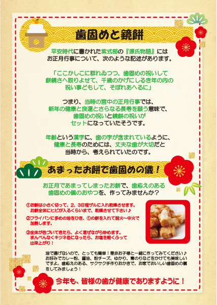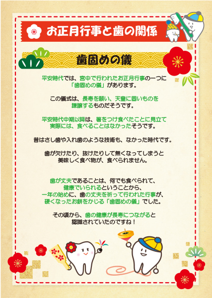 《歯固めの儀》平安時代では、宮中で行われたお正月行事の一つに この儀式は、長寿を願い、天皇に固いものを 平安時代中期以降は、箸をつけ食べたことに見立て 昔はさし歯や入れ歯のような技術も、なかった時代です。 歯が欠けたり、抜けたりして無くなってしまうと