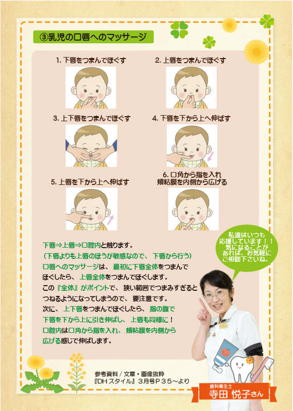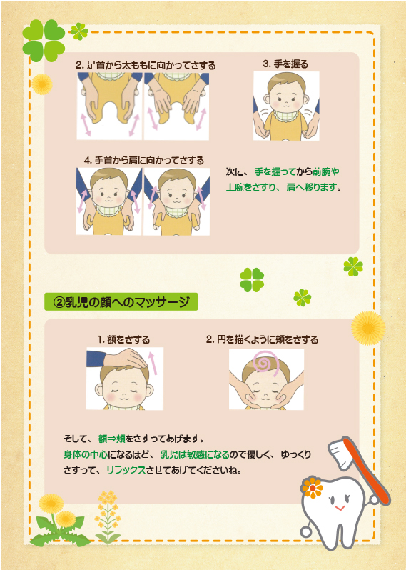 《カムカムマッサージ》①乳児の手足へのマッサージ 1. 足を握る 次に、手を握ってから前腕や 2.足首から太ももに向かってさする ②乳児の顔へのマッサージ 1.額をさする そして、額⇒頬をさすってあげます。 ③乳児の口唇へのマッサージ 1.下唇をつまんでほぐす 下唇⇒上唇⇒口腔内と触ります。 |