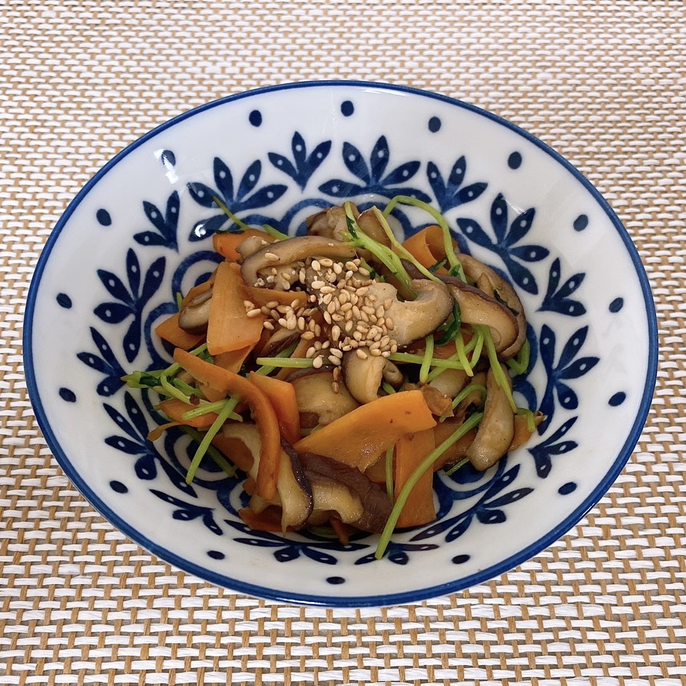 レシピ:①しいたけ、にんじん、豆苗のゴマ油炒め