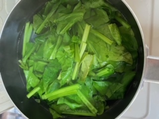 ①ほうれん草をきれいに洗い、根元を切り落とした後、