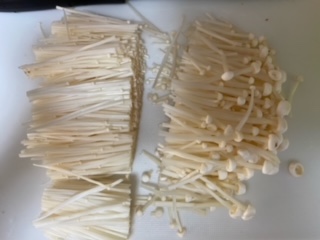 ②えのきの根元を切り落とし、水でよく洗ったら縦に半分に切り