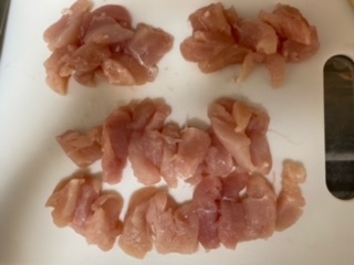 ③鶏ささみ肉を一口大に切り、鍋で茹でます。