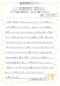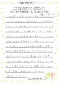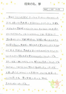 実習感想文レポート 初めは、アシストの業務を見学させていただき、「私にできるのかな」と自信が無く、 周りのみなさんのサポートで、新しいことにもどんどんチャレンジさせていただき、 改めて、ヨリタのみなさんの温かさ、優しさを感じ、これからも、もっと頑張って 先輩方からたくさん学び、どんどんチャレンジして、成長していきたいです。