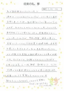 将来の私、夢 私が歯科衛生士になりたいと思った理由は、いくつかあるうちの1つですが、 専門学校に入って間もない時は、診療補助を主にしたいと思っていましたが、 私は、患者さまやスタッフさんから信頼される、素敵な歯科衛生士になることが また、何歳になっても笑顔を忘れることのない、素敵な大人になれるよう、 |