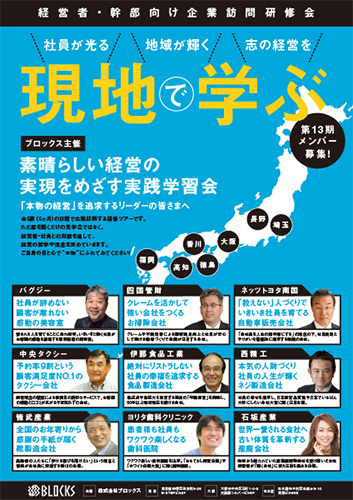 | ブロックスの映像の中にいるような 「リアリティあるベンチマーキング研修会」が、コンセプト。 五感すべてで、体験してください。 ① 感動サービス・社内行事が体験できます。 ② 経営者と直接対話できます。 ③ 社員さんとの対話学習ができます。 働く人はどう感じているのか。 ④ 毎回、振り返りの時間を設けています |