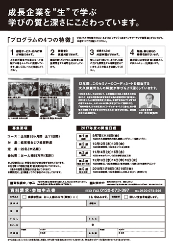 ○第 2 講 (高知) 10月12日(木)13日(金) ○第 3 講 (長野) 11月14日(火)15日(水) ○第 4 講 (徳島・香川・大阪) 12月13日(水)14日(木)15日(金) ○第 5 講 (埼玉・東京) 2018年1月18日(木)19日(金) |