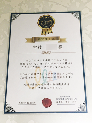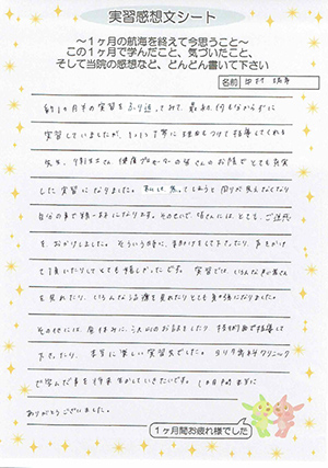 ■実習感想文シート 約1カ月半の実習を振り返ってみて、最初何も分からずに実習していましたが、 私は焦ってしまうと、周りが見えなくなり自分の事で、精一杯になります。 そういう時に、手助けをして下さったり、声をかけて頂いたりして、とても 実習では、いろんな患者さんを見れたり、いろんな治療を見れたり、とても勉強に その他には、昼休みに沢山のお話をしたり技術面で指導して下さったり、 ヨリタ歯科クリニックで学んだ事を将来生かしていきたいです。 1ヵ月間、本当にありがとうございました。