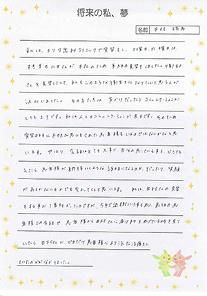 ■将来の私・夢 私は、ヨリタ歯科クリニックで実習をし、月曜日、水曜日は担当の小田さんが 衛生士さんを見学していて、私もこのような衛生士になりたいと思う人が その方たちは、声かけだったり、コミュニケーションがとても上手です。 やはり、会話はとても大事で、自分の思っている事を、どう伝えたら患者様が 私は田村さんの見学をすることが、1番多かったのですが、今年で退職という事もあり 私も田村さんのように、この衛生士に見てもらってよかったなと思われる |