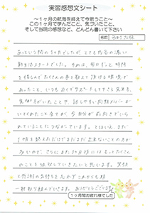 ■実習感想文シート ・あっという間の1ヶ月でしたが、とても内容の濃い新生活スタートでした。 とはいえ、まだ1ヶ月を終えただけで、まだまだ出来ないことの方が多いので 笑顔と感謝の気持ちを忘れず、これからも精一杯取り組んでいきます。 ・入職した最初の日から、この1ヵ月間は1日1日が濃くて、嬉しかった日や 周りの先輩達のおかげで、色々教えて頂き、右も左も分からなかった私が、どうにか 毎週水曜日の新人グループ研修や、月曜日のお昼休みの発表を通して、「ヨリタらしさ」 2ヶ月目は、この1ヶ月目の初心を忘れず、もっと上を目指してがんばりたいと思います。