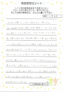 ■実習感想文シート ヨリタに入職して一ヵ月、本当にあっという間でした。 毎日、毎時間が勉強と緊張と失敗の連続で、一日一日がめまぐるしく過ぎていったように こうして自分が成長していけるのも、先輩方の指導のおかげだと思っています。 私が失敗した時でも、いつも側でフォローしてくださり、「次はこういう時は そんな皆さんを見て、私も早く先輩のようにテキパキと仕事をこなせるようになりたいと 仕事をする上で「この人のようになりたい」と、思える人が近くにいる事は、自分が