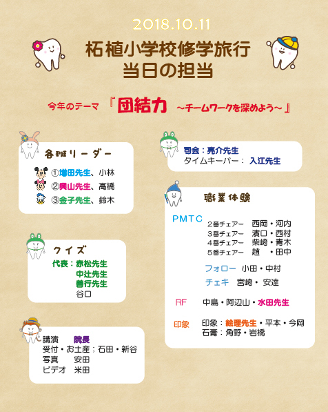 柘植小学校関係者そして修学旅行生保護者の皆様へ 今回は、修学旅行先として、私たちの医院を選んで頂き 「まさか、こんなことが起こるなんて」 「大人になったら、何になる。」 だからこそ、私たちの医院を訪れる柘植小学校の子供たちには 私たちが目指す、理想の歯科医院は、 今回のテーマは、「団結力 ~チームワークを深めよう~」。 この10年、ワクワク楽しい医院を作るため その結果、今では医院には笑顔が溢れ、ここで働く皆は それは、学校でも同じ。 そんな「チームワーク」や「団結力」の大切さを、 最後になりましたが、このような成長する (医)ゆめはんな会 |