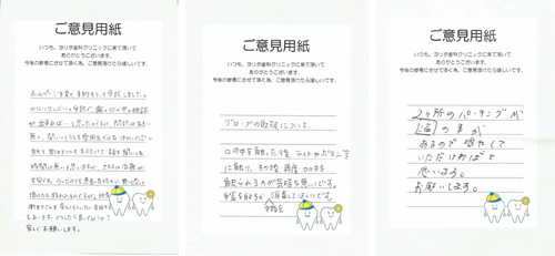 私たちの医院では、『患者様の声』を大切にしています。 あなた様のひと言が、私たちの成長につながります。 良かったこと、改善点など、お聞かせ下さいね。 |