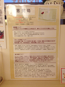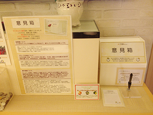 待合室向かって右側に、ご意見用紙とご意見箱を設置しております。
