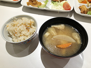 かやくご飯とお味噌汁も、具沢山。