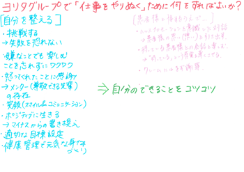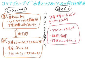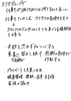 沢山の色んな意見が出ていました。「仕事を楽しむ」「向上心を持つ」「明確な目標を立てる」