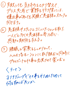 ・今回の3回の新人研修の締めくくりとしてワークで、「ヨリタで働き続けるには」と言う課題で