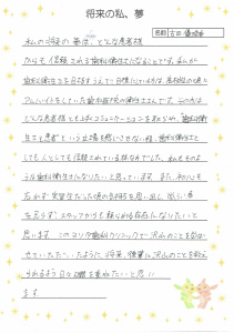 ◆実習感想文シート ・今回ヨリタ歯科クリニックで、臨床実習をさせていただき、挑戦することの ◆将来の私、夢 ・私の将来の夢は、どんな患者様からも信頼される歯科衛生士になることです。