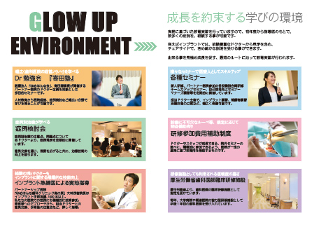 GLOW UP ENVIRONMENT ~成長を約束する学びの環境~ 実務に基づいた教育実習を行っていますので、初年度から指導医のもとで、 例えばインプラントでは、経験豊富なドクターから見学を含め、 出来る事を見極め成長を促す、最短のルートに沿って教育実習が行われます。 ■幅広く歯科医院の経営ノウハウを学べる 医療法人「ゆめはんな会」、寄田理事長が開催する、パートナー医院の