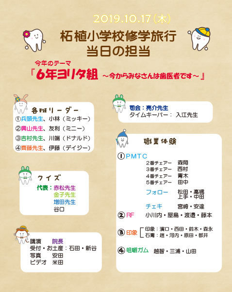柘植小学校関係者そして修学旅行生保護者の皆様へ 今回は、修学旅行先として、私たちの医院を選んで頂き 「まさか、こんなことが起こるなんて」 「大人になったら、何になる。」 だからこそ、私たちの医院を訪れる柘植小学校の子供たちには 今回のテーマは、「6年ヨリタ組 ~今からみなさんは歯医者さんです~」 この20年、歯科のイメージをビクビク恐いから、ワクワク楽しいに その結果、今では訪れる患者様の笑顔が溢れ、ここで働くスタッフは それは、学校でも同じ。 この「職業体験」を通じ、思いやりや感謝の 最後になりましたが、このような成長 (医)ゆめはんな会 |