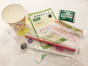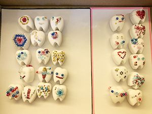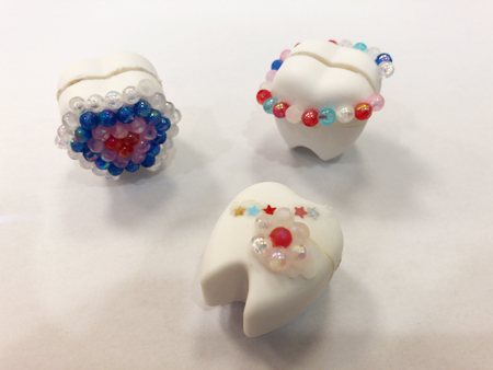 歯科体験セットと、実行委員会チームのスタッフのハンドメイド歯型のフォトスタンドです。