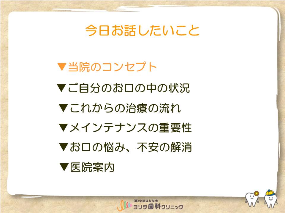 また、カウンセリング時は、当院の治療方針、すなわち予防やメインテナンスの大切さも