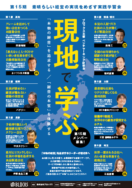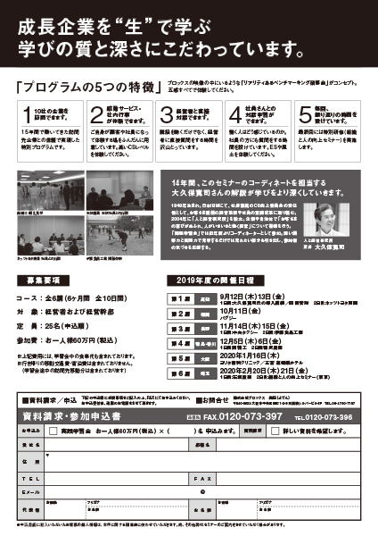 ○第 1 講 (高知)2019年 9月12日(木)13日(金) 1日目:大久保寛司氏の導入講義/四国管財/2日目:ネッツトヨタ南国 ○第 2 講 (福岡) 2019年 10月11日(金) ○第 3 講 (長野)2019年 11月14日(木)15日(金) ○第 6 講 (埼玉)2020年2月20日(木)21日(金) |