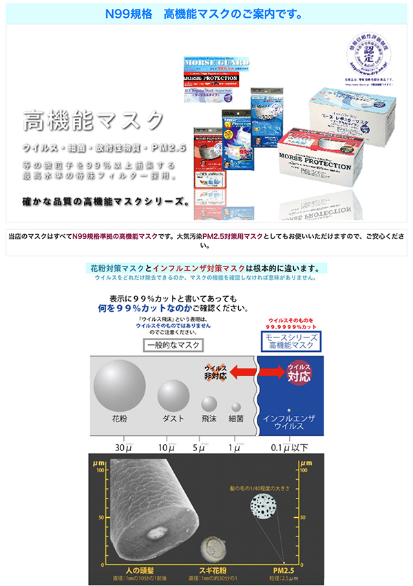 一般的にマスクは、1ミクロン以上の花粉や細菌を除去する目的で作られているので(上図参考) 新型インフルエンザ対策マスクを見ると、「N95規格」と書かれたマスクがあります。 マスクを備蓄する時、必ずこの数値を確認するようにしましょう。 ロナルド・モース博士が考案したモースシリーズは、 近年、中国で非常に問題となっている【PM2.5(粒径2.5μm以下の浮遊上物質)】と呼ばれている
