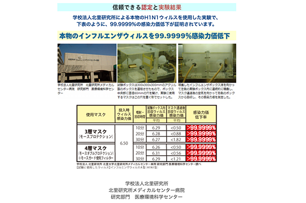 このマスクを着用することで、ウイルスの99.9999%感染力を低下させることが