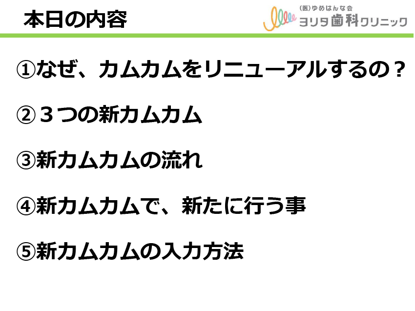 ・カムカムで来院されたお子様や保護者の方、治療後の患者様への説明など、詳しく説明し