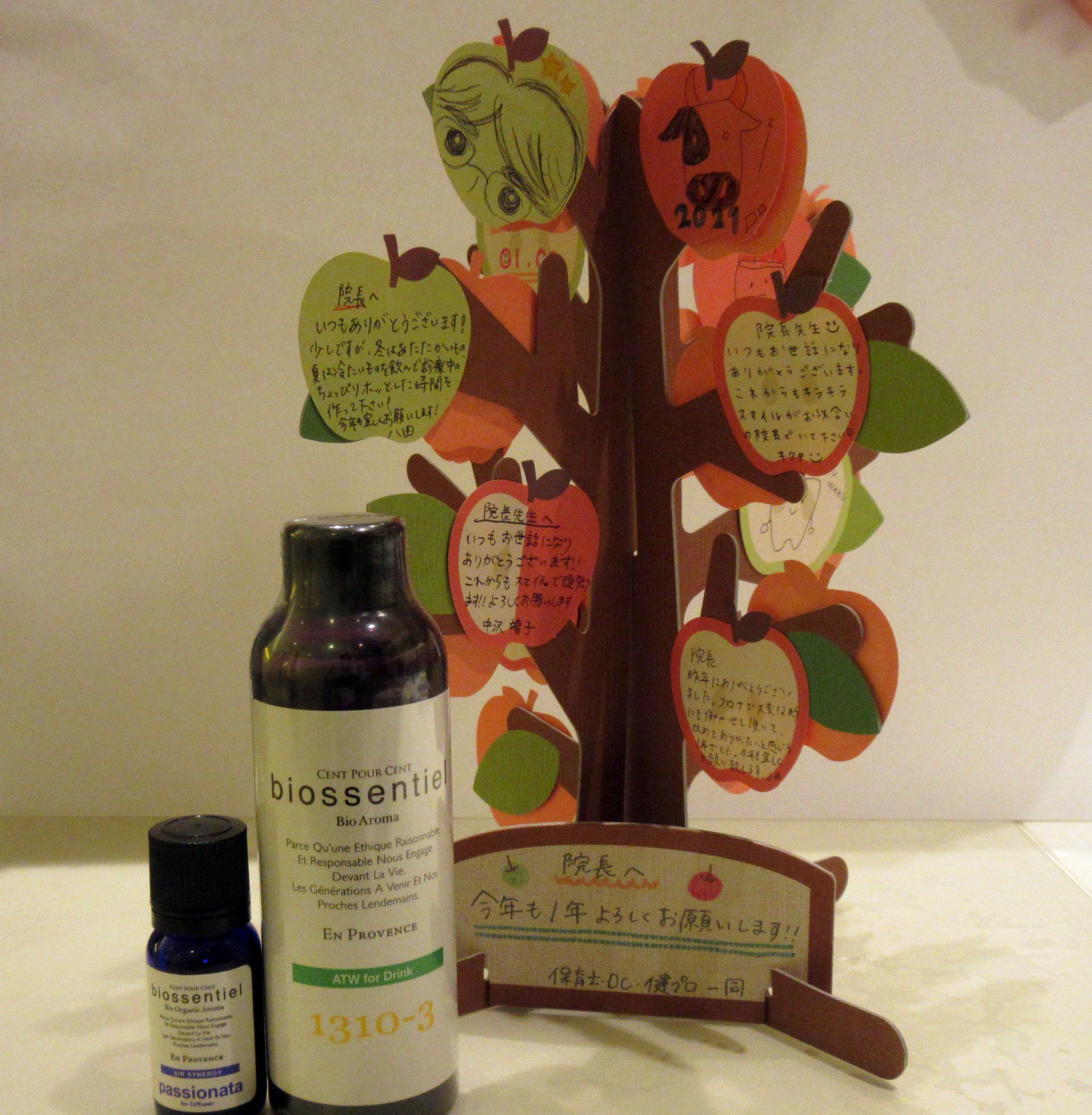 アロマオイルとアロマウォーターと、スタッフからのメッセージツリー。