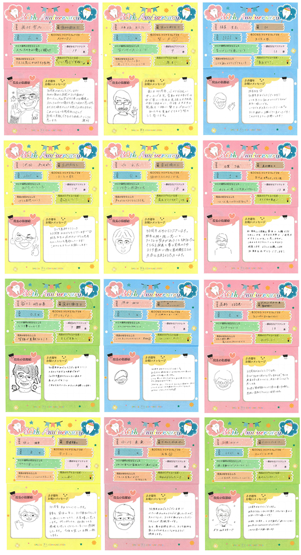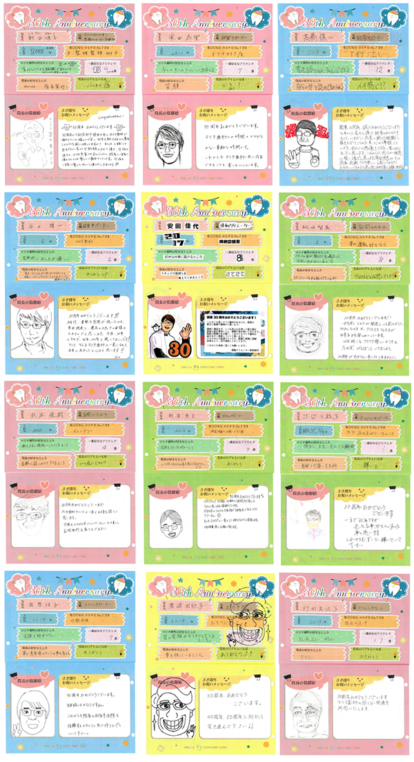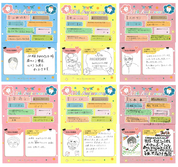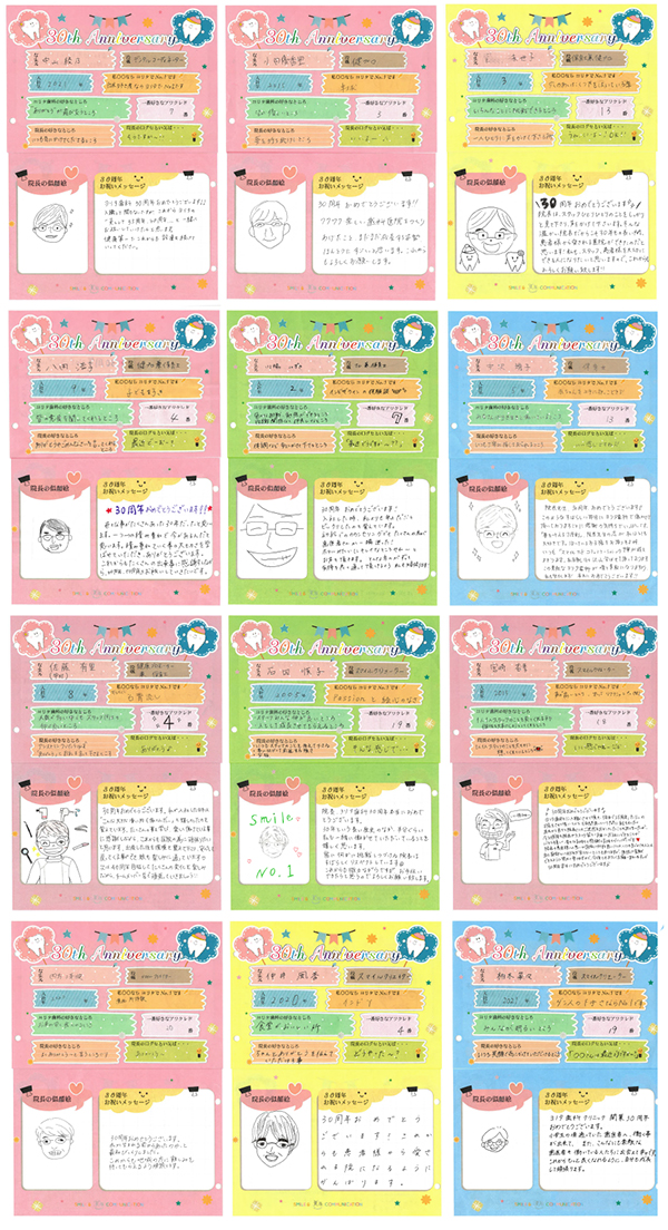 | ・なまえ ・役職 ・入社年 ・私〇〇ならヨリタでNo.1です ・ヨリタ歯科の好きなところ ・一番好きなアワクレド ・院長の好きなところ ・院長の口グセといえば… ・院長の似顔絵 ・30周年お祝いメッセージ |