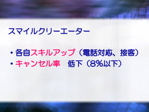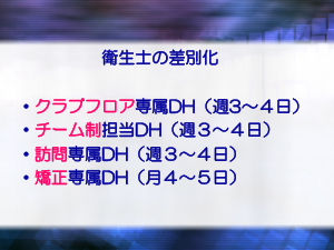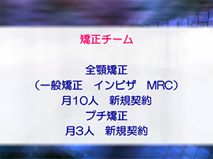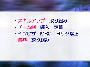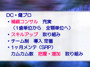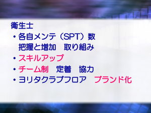 | ①ヨリタクラブフロア活性化 ②一般治療の効率化 ③自費率の向上 ④マウスピース矯正の普及 ⑤訪問診療の人員補強 ⑥人事評価制度の導入 ⑦診療チーム制の確立 |