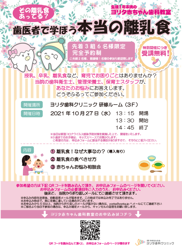 ■『その離乳食あってる?歯医者で学ぼう本当の離乳食』 授乳、卒乳、離乳食など、育児でお困りごとはありませんか? ■開催場所、日時 ■タイムスケジュール 先着3組6名様 限定 ■参加費用 ■内容 |