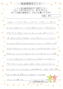 ◆実習感想文シート ・1ヶ月を終えて、少しずつ医院の雰囲気にも慣れてきました。 また、患者様が治療に対して不安にならない様に言葉掛けをされたり、 まだまだ知識もなく、緊張のあまり、言葉掛けも対応も十分に出来ていませんが また、治療について、きちんと覚えて対応出来るよう様にしたいと思いました。 緊張や分からないことが多くて、日々ご迷惑を掛けていますが、皆さんが優しく また、間違った対応については、丁寧に教えて下さることで振り返り、次こそは まだまだ到らない所ばかりですが、早く少しでも皆さんのお力になれる様に 笑顔を大切にを意識して、今後も頑張りますので、宜しくお願いします。 |