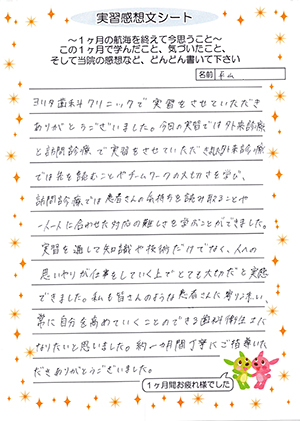 お忙しい中、ご指導いただき、とても自分自身成長することのできた臨床実習期間でした。