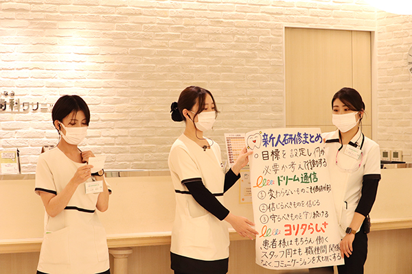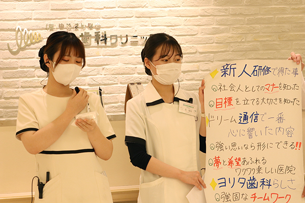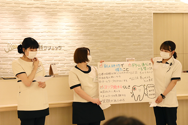 | ①4月1日からの新人研修で得たこと ②自分自身がドリーム通信で一番心に響いた内容 ③自分自身の考えるヨリタ歯科らしさ(どうなりたいか) |