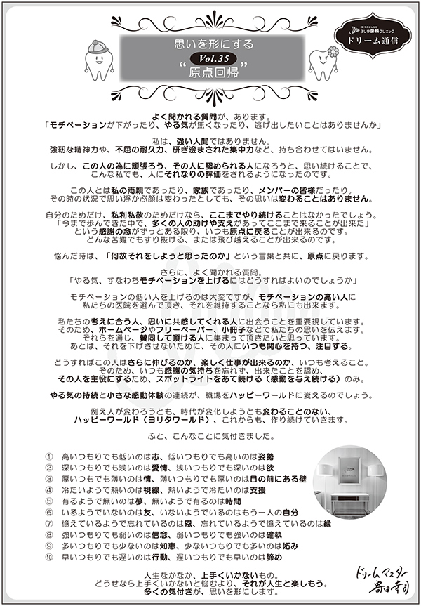 ■Vol.35 原点回帰 よく聞かれる質問が、あります。 私は、強い人間ではありません。 しかし、この人の為に頑張ろう、その人に認められる人になろうと、思い続けることで、 この人とは私の両親であったり、家族であったり、メンバーの皆様だったり。 自分のためだけ、私利私欲のためだけなら、ここまでやり続けることはなかったでしょう。 悩んだ時は、「何故それをしようと思ったのか」という言葉と共に、原点に戻ります。 さらに、よく聞かれる質問。 モチベーションの低い人を上げるのは大変ですが、モチベーションの高い人に 私たちの考えに合う人、思いに共感してくれる人に出会うことを重要視しています。 どうすればこの人はさらに伸びるのか、楽しく仕事が出来るのか、いつも考えること。 やる気の持続と小さな感動体験の連続が、職場をハッピーワールドに変えるのでしょう。 例え人が変わろうとも、時代が変化しようとも変わることのない、 ふと、こんなことに気付きました。 ① 高いつもりでも低いのは志、低いつもりでも高いのは姿勢 人生なかなか、上手くいかないもの。 |