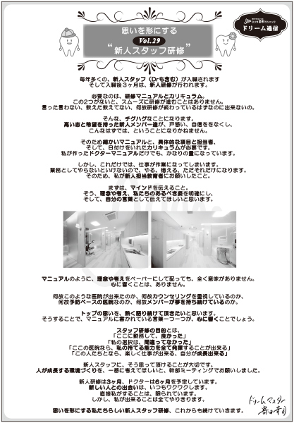 【ドリーム通信読み合わせ】 ○新人スタッフ研修 ・ヨリタ歯科クリニックは規模の大きい医院ですので、最初にこの新人スタッフ研修を ・入職してから、先輩の石田さんに理念やあるべき姿についてお話を聞く事が