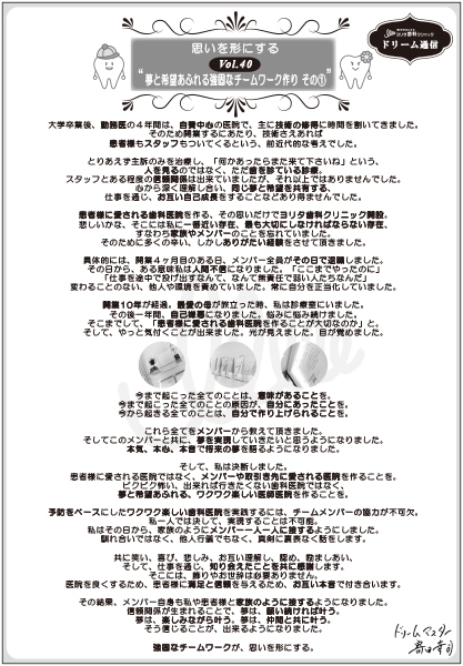○夢と希望あふれる強固なチームワーク作り その① ・仕事をすることにおいても、生きていく中でも、自分一人では何もできないので ・このVol.40を読んだ後、改めてただ仕事を一人だけでコツコツ、黙々とやるのではなく |