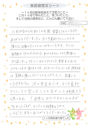 次の実習先では、ヨリタ歯科クリニックで学んだことを生かして、頑張ろうと思います。