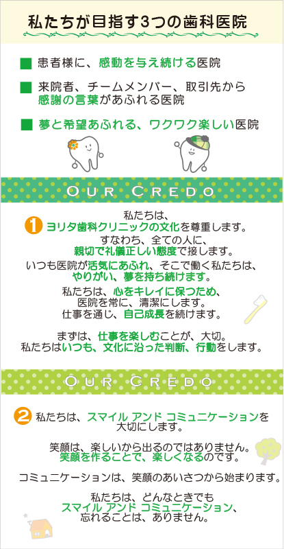 ヨリタ歯科クリニックの文化を大切にするように礼儀や清潔、常に自己成長を続ける事
